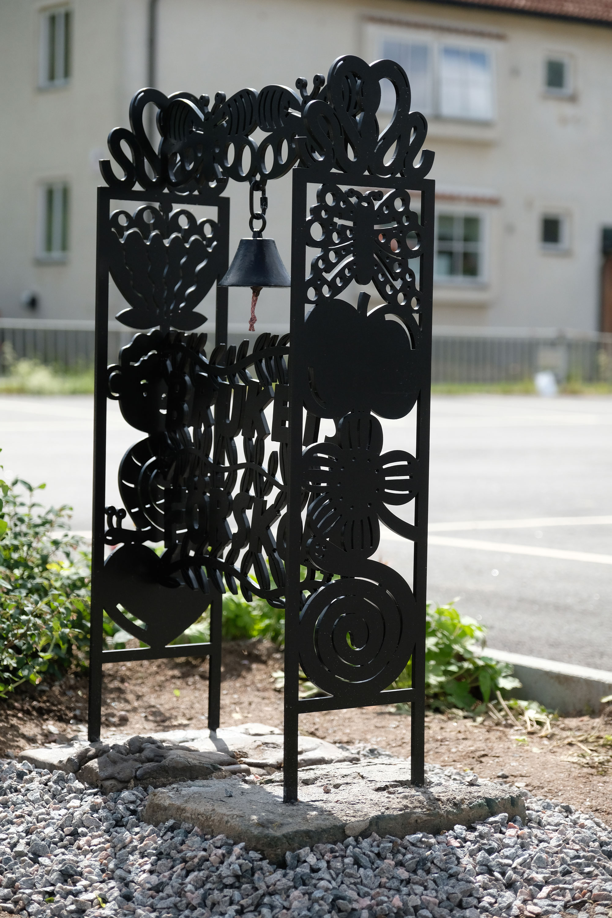 Based on clock tower in Söderfors that was used to ring in the day for the workers at the ironworks in Söderfors. The children had a vote about the motifs on the sign.