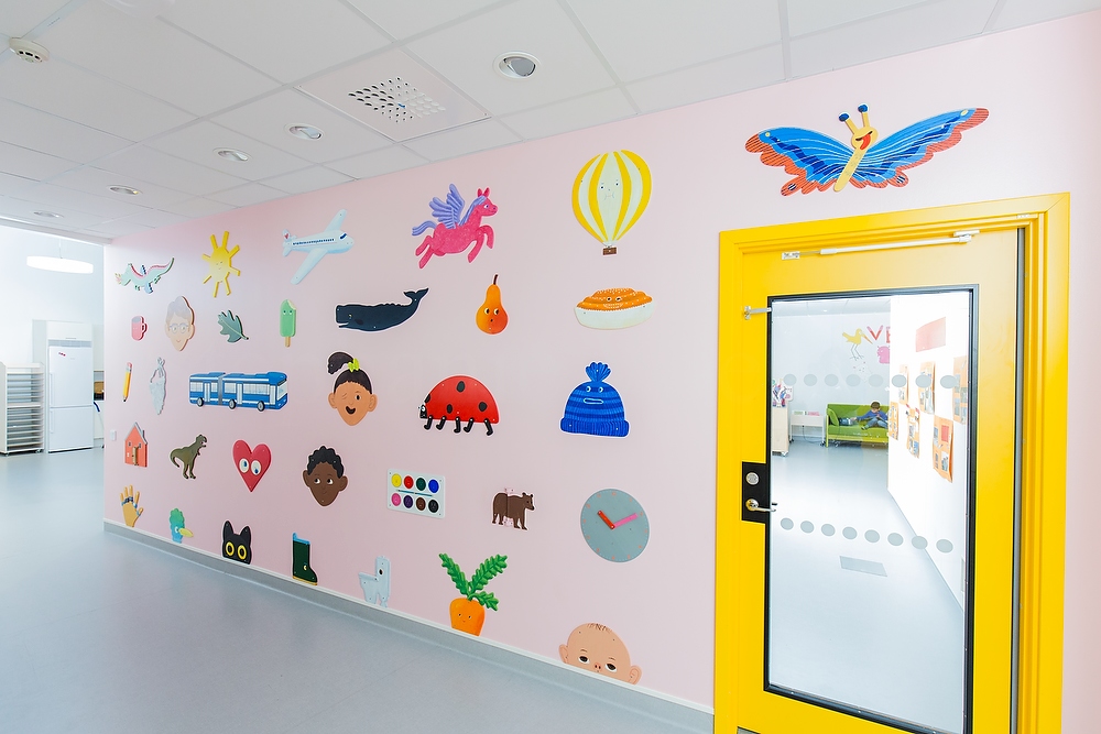 The idea for Pekväggen comes from picture books for toddlers, a group of characters and objects to point to and talk about. We asked the kids what they wanted for their new pre school, the kids answered: lots of pink, glitter, flying dinosaurs, a santas beard with eyes and a mouth (?!) and - the bus.